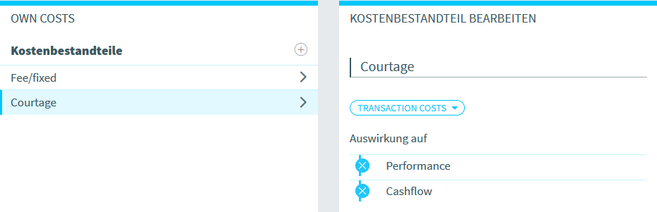Legen Sie fest, ob dieser Kostenbestandteil relevant für die Performance- und/oder Cashflow-Berechnung ist. Aktivieren bzw. deaktivieren Sie dazu das jeweilige Symbol vor "Performance" und "Cashflow". Diese Auswahl wirkt sich dann z. B. schon beim Erfassen von Transaktionen im beim "Ausmachenden Betrag" aus.
