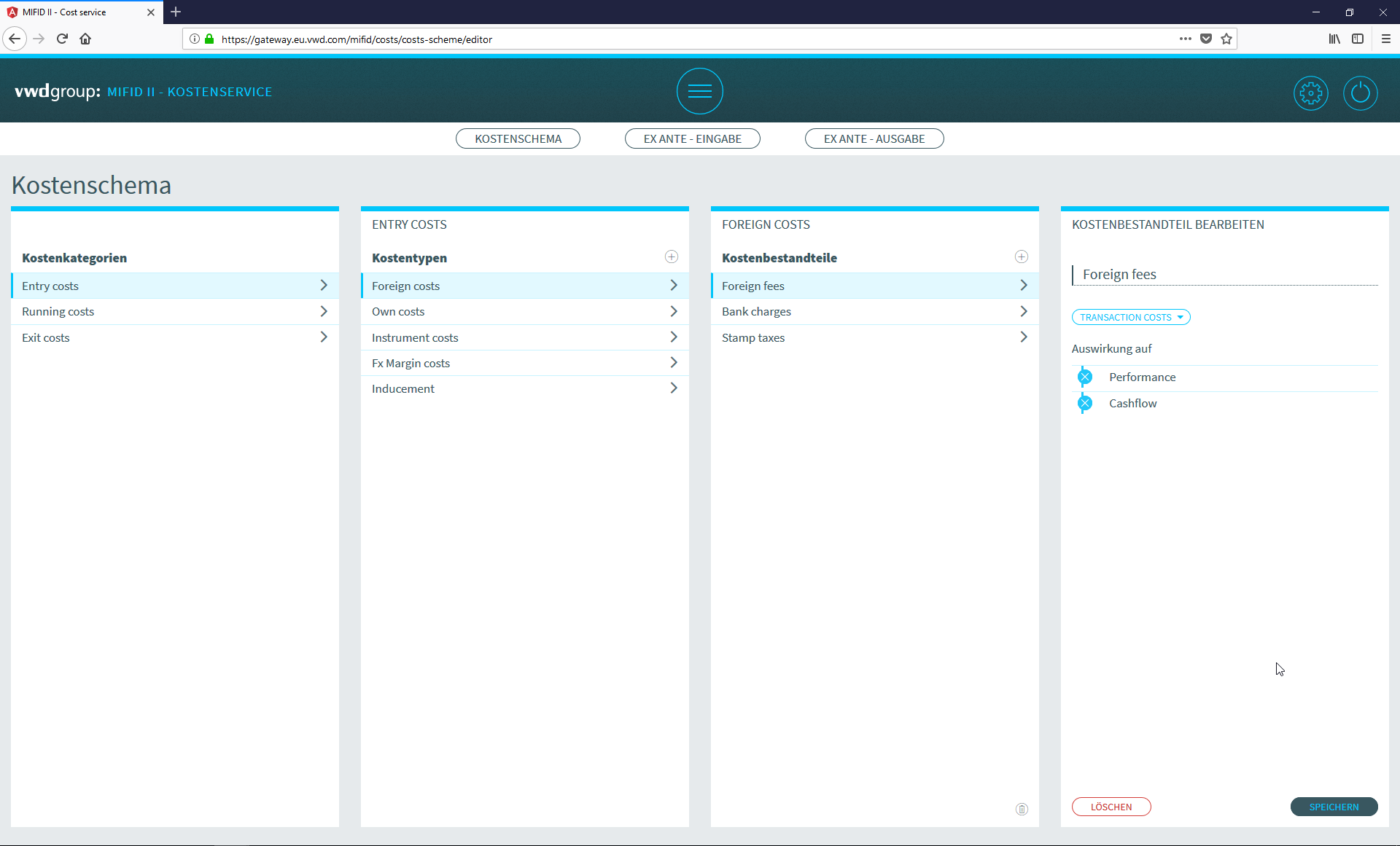 Wählen Sie auf der Seite "MiFID II - Kostenservice" den Button "Kostenschema".