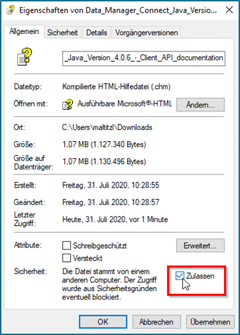 Wegen unterschiedlicher Windows-Sicherheitseinstellungen gibt es mitunter Probleme, die technische Schnittstellenbeschreibung (Datei vom Typ *.chm) nach dem Download zu öffnen bzw. korrekt anzuzeigen.