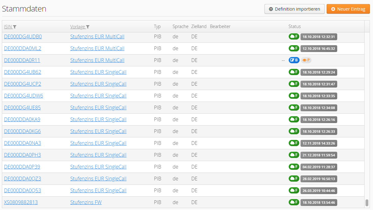 Ähnlich wie bei Produktdaten kann der Audit-Trail eines jeden Stammdatensatzes in diesem selber gefunden werden. Ein Produkt kann durch Klicken auf die ISIN geöffnet werden, unter