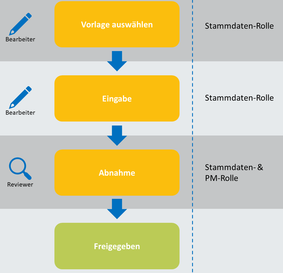 Stammdaten unterliegen ebenfalls einem Vieraugenprozess zur Bearbeitung und Freigabe. Dieser Prozess erfordert keine Interaktion der Rollen "Legal & Compliance" und "Release-Manager". Die Abnahme im Vieraugenprinzip erfolgt durch die PM-Rolle.
