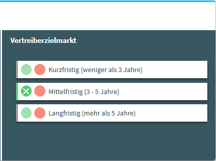 | Vertreiberzielmarkt | In dieser Spalte setzen Sie die Werte des Vertreiberzielmarkts für die einzelnen Kategorien. Wählen Sie dazu die gewünschte Zeile aus. Auch hier symbolisiert die grüne Farbe den positiven, die rote Farbe den negativen Zielmarkt. Hierbei muss jede Kategorie gesetzt sein, für folgende Kategorien ist Mehrfachauswahl möglich: