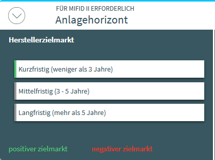 In diesem Beispiel ist der Wert des positiven Zielmarkts für den Anlagehorizont im Vertreiberzielmarkt "Mittelfristig (3 - 5 Jahre)". Für den negativen Zielmarkt ist kein Wert gesetzt. |