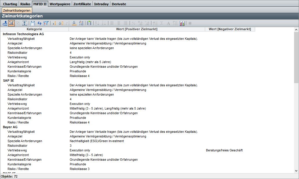 Im können Sie solche Wertpapiere z. B. in der Tabelle "Zielmarktkategorien" öffnen und sich die Daten aus dem Zielmarktservice anzeigen lassen: