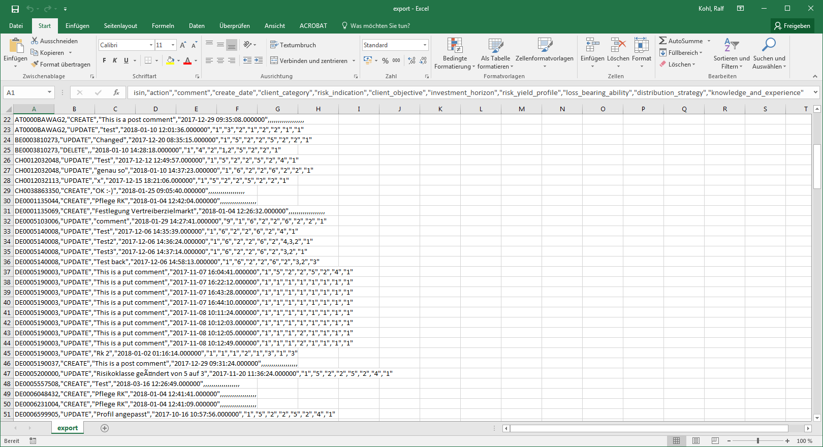 Die Datei kann dann z. B. in Microsoft Excel geöffnet und bearbeitet werden. Im Einzelnen enthält die Datei folgende Informationen:- ISIN