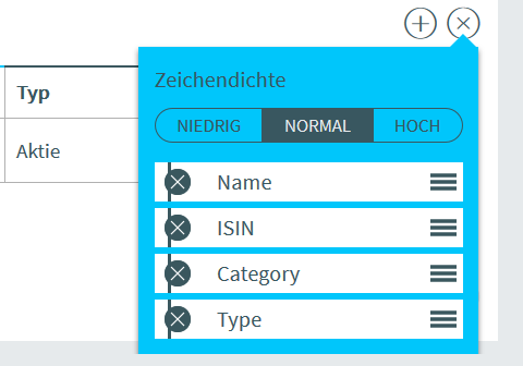Wählen Sie oben die Zeichendichte für die Tabellenzellen. Mit der Einstellung "Hoch" wird die Tabelle mit den Wertpapieren enger, mit der Einstellung "Niedrig" luftiger.