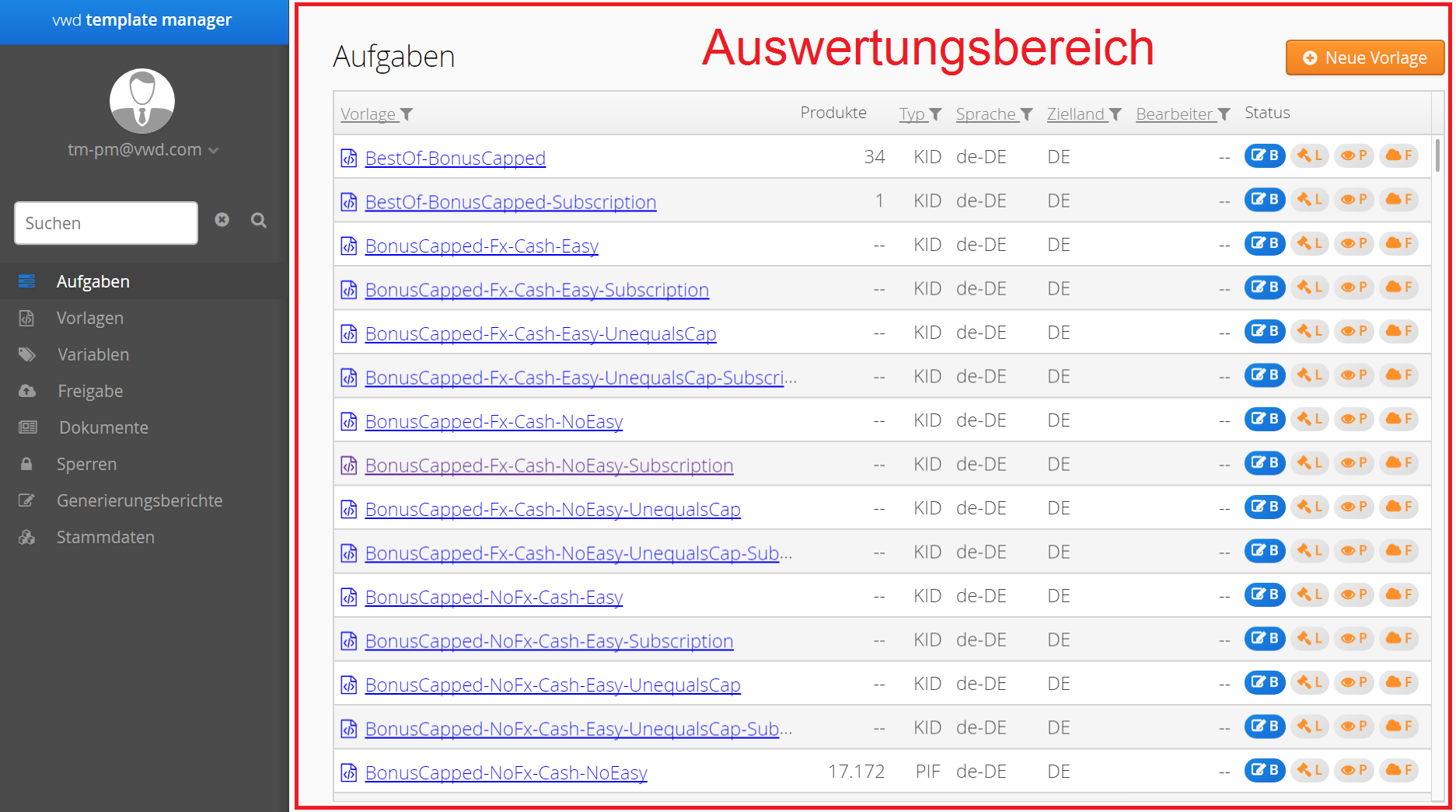 Rechts von der Navigationsleiste finden Sie den jeweiligen Auswertungsbereich, dieser enthält abhängig von der jeweiligen Sicht alle nötigen Informationen und Steuerelemente zur Umsetzung einzelner Aufgaben innerhalb des Infront Template Manager.