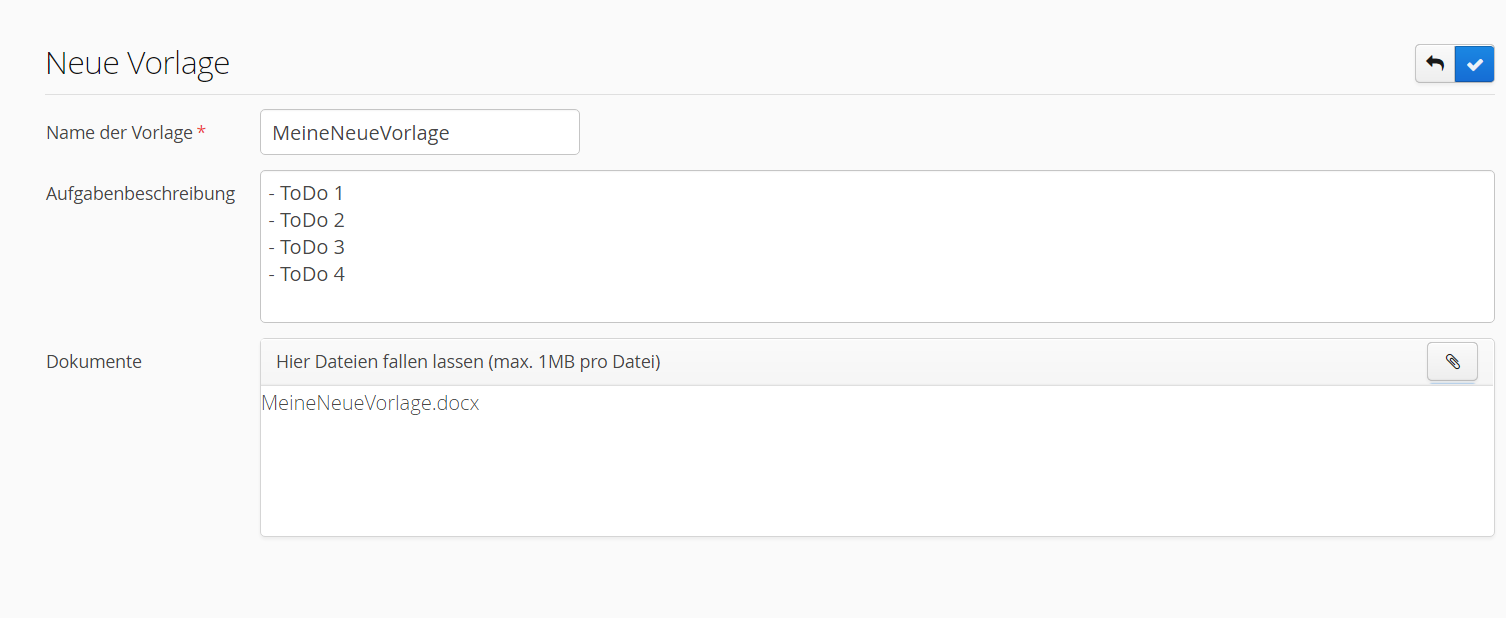 3. Vergeben Sie einen eindeutigen Namen für die Vorlage. Beschreiben Sie auch nach Möglichkeit im Freitextfeld "Aufgabenbeschreibung", was für die Vorlage zu tun ist. Um zusätzliche Dokumente an die Aufgabe anzuhängen, klicken Sie auf das Icon und wählen Sie die entsprechende Datei.