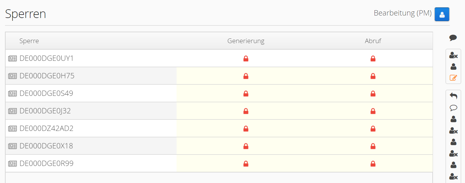 Im Auswertungsbereich "Sperren" verwalten Sie die Sperren auf ganze Vorlagen oder einzelne Produkte (ISINs). Gesperrt werden können dabei die Generierung und der Abruf von Wertpapieren. Auch die Bearbeitung von Sperren geschieht nach dem Vieraugenprinzip.