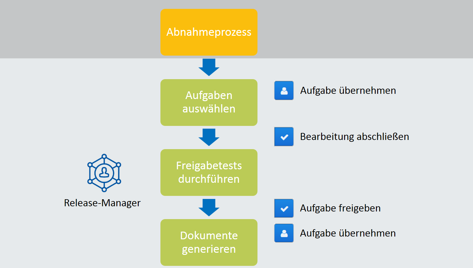 Beim Veröffentlichungsprozess testet der Release-Manager die abgenommenen Vorlagen, von mehreren Vorlagen genutzte Abschnitte sowie Variablen als auch Wertelisten und gibt sie für die Generierung frei.