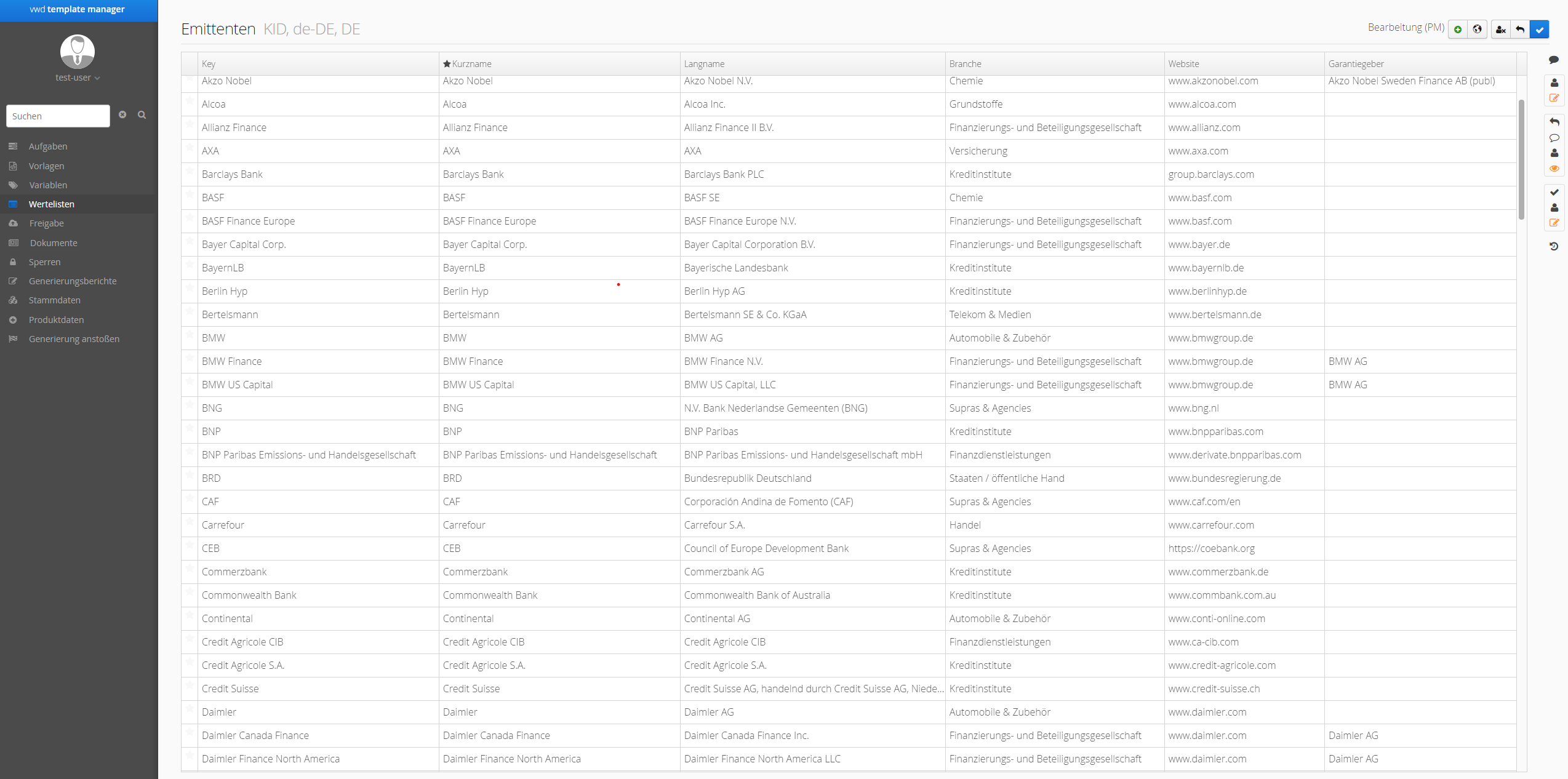 Klicken Sie auf das Icon "Wertelisten-Bearbeitungsprozess übernehmen", um die Wertelisten bearbeiten zu können und für die Bearbeitung durch andere zusperren.