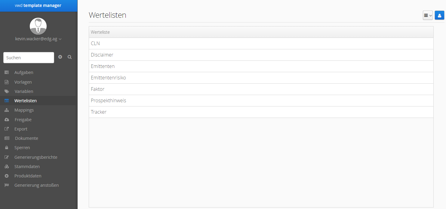 Öffnen Sie mit einem Klick auf "Wertelisten" in der Navigationsleisteden Arbeitsbereich"Wertelisten".