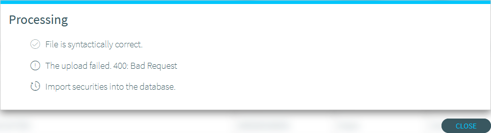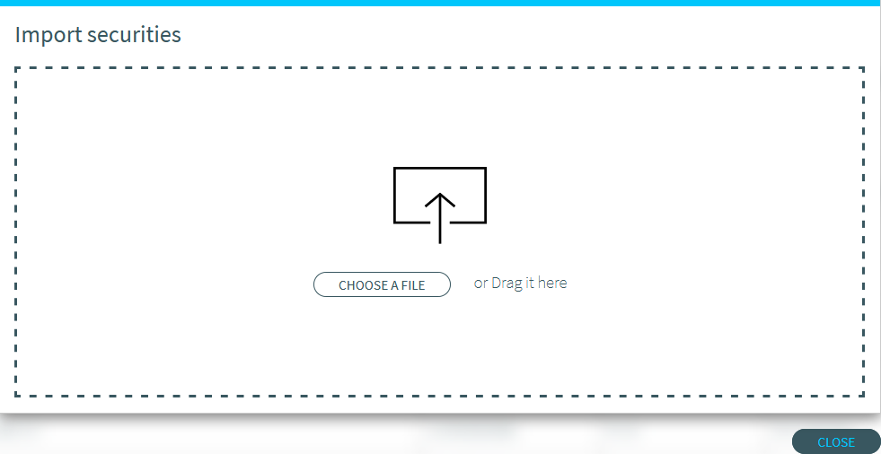 Then drag the desired CSV file into the "Import securities" input window or select the CSV file by using the "Choose a file" button. This imports the ISINs included in the file. An message window provides details about the result of the import.