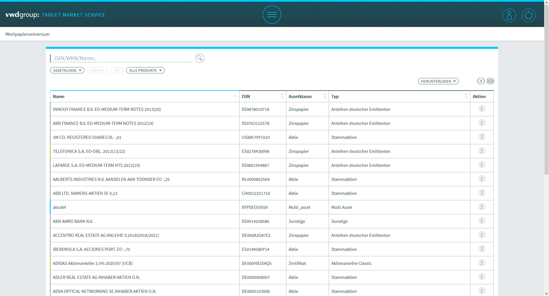 When you open the Target Market Service via the web interface as described above, you are taken to the "Security universe" page.