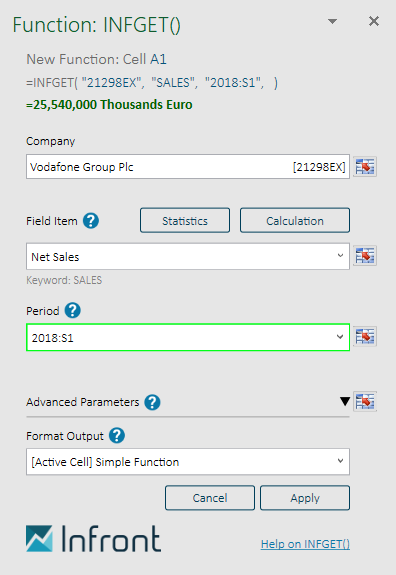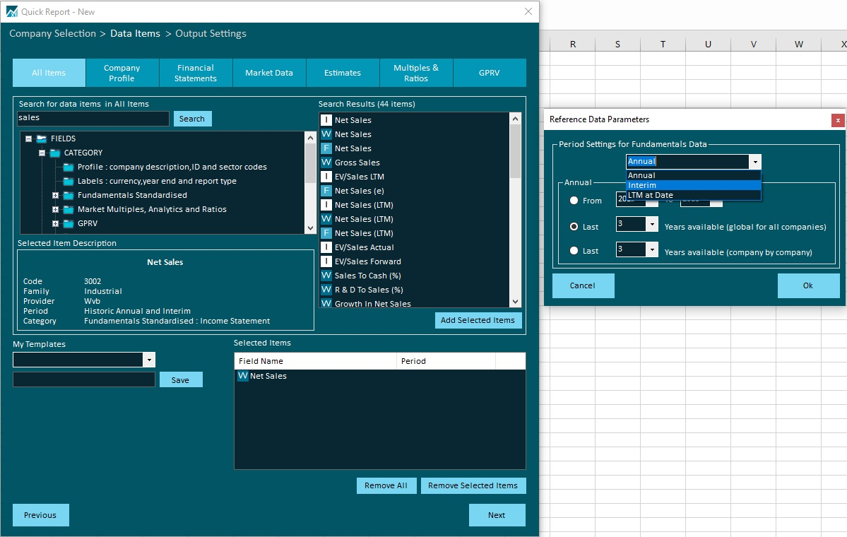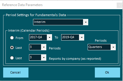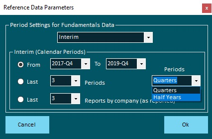 To retrieve interim periods using Excel Add-in, use the following syntax: