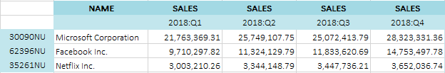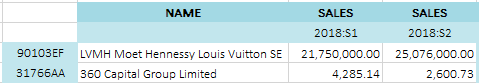 =INFGET("30090NU","SALES","LASTINT") and =INFGET("00453EF","FYE","LASTINT")
