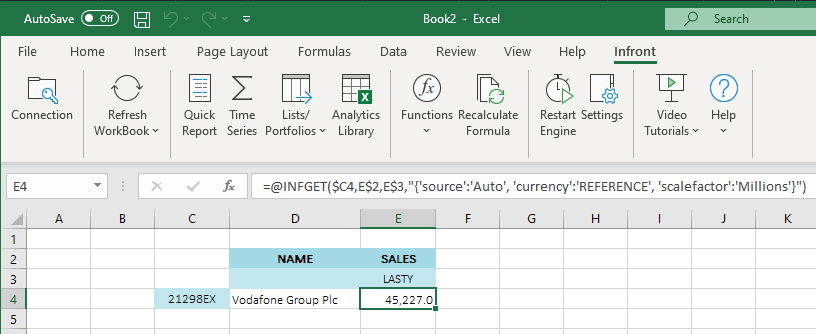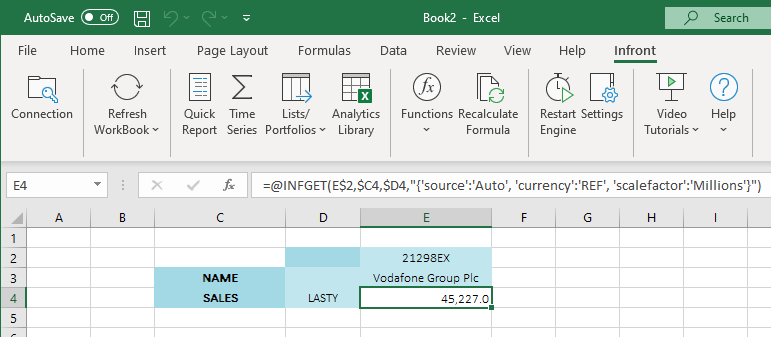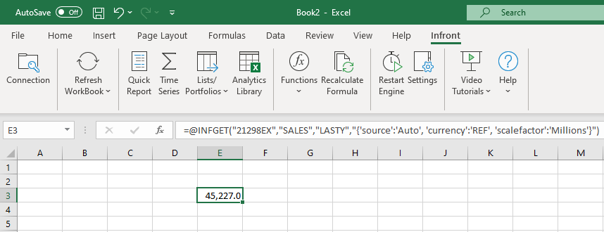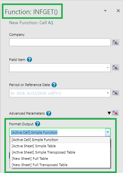 The result and the parameters of the function are displayed in a table of 3x3 cells, in the active sheet. Advanced parameters are set directly in the function (here an INFGET() function with some advanced parameters).